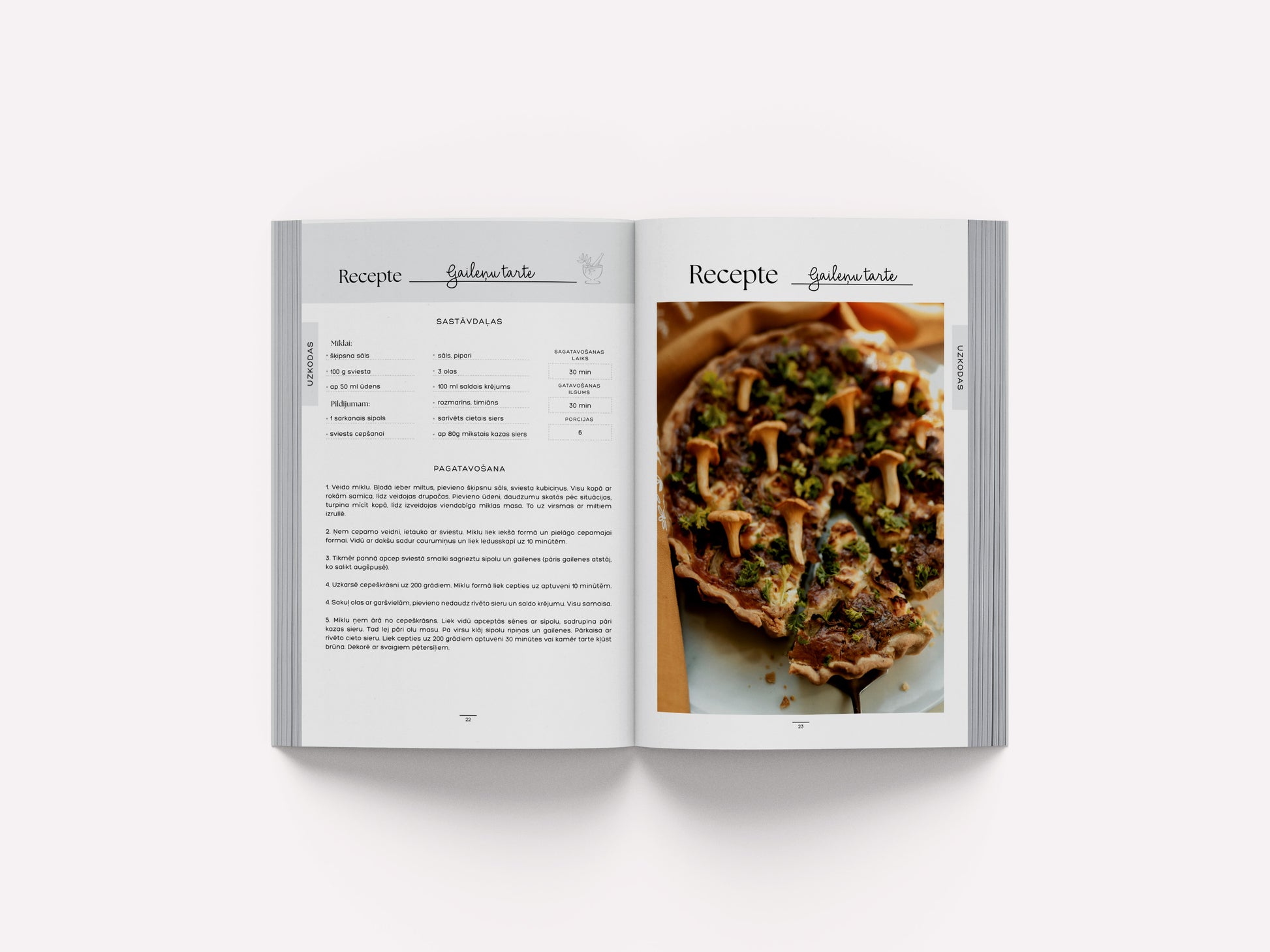 - 7 iedvesmas receptes katrā no sadaļām (Medus kūka, cepumu mājiņas, sāļā karamele, gaileņu tarte u.c.)